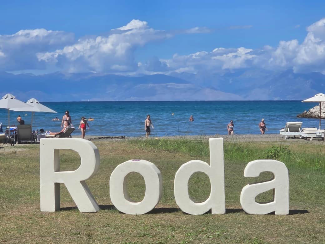 - The sandy beach at Roda with its gently sloping waters (1 mile / 1.5km)